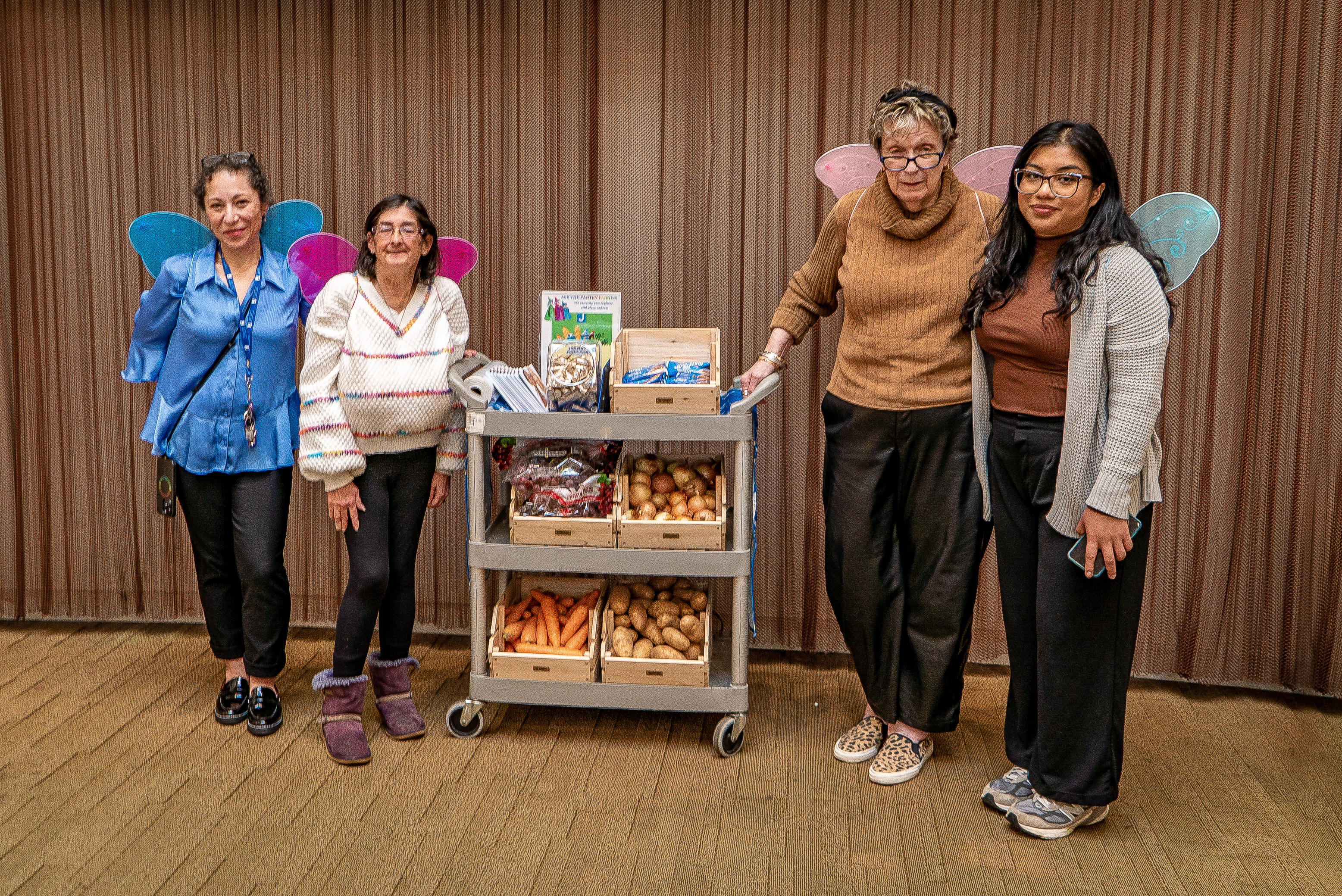 Clad in wings and tutus, these dedicated volunteers – many of them older adults – help bring surplus food from the food pantry to the social hall where seniors congregate weekly and help them place orders from pantry tablets.
